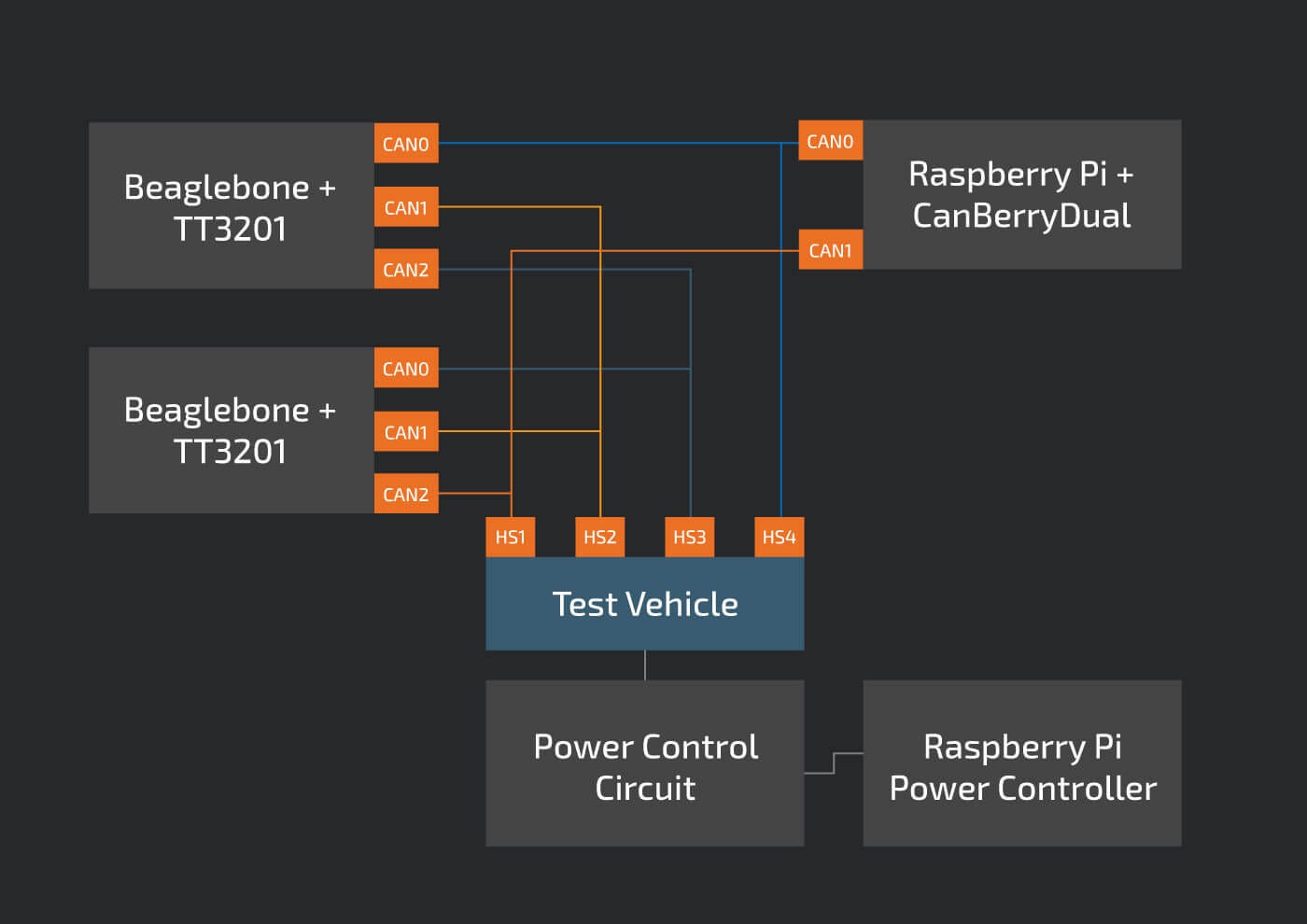 “Along with that Two TT3201 three-channel CAN Capes attached to Beaglebones, and one CanBerryDual attached to a Raspberry Pi. also another Raspberry Pi to remotely control the test vehicle.”